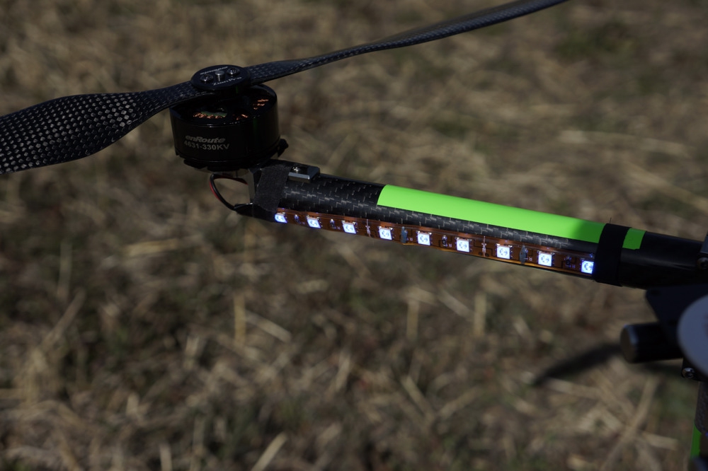 機体マーキング&LED 飛ばすとわかりますが、マルチコプターは前後がわかりづらいものです。機体の形状が前後でほぼ等しく、わかりづらいのです。機体の前部と後部のアームに赤と緑のマーキングを施してこの悩みを解消してあります。また、昼間でもみやすいLEDを追加してさらに視認性を上げております。また、このLEDにより、夜間でのフライトも可能となっております。 |